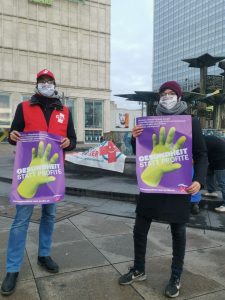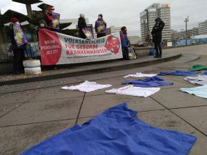 Am 20.01. waren wir auf dem Alexanderplatz und haben eine kleine Aktion veranstaltet, um darauf aufmerksam zu machen, dass der von uns initiierte Volksentscheid Gesunde Krankenhäuser mittlerweile seit 3 Jahren darauf wartet, umgesetzt zu werden. Der Berliner Senat hat behauptet, der Volksentscheid wäre nicht rechtmäßig, weswegen eigentlich am 20.01. die Verhandlung vor dem Berliner Landesverfassungsgericht gewesen wäre. Obwohl diese verschoben wurde, haben wir in einer Aktion klar gemacht, dass Personal in Krankenhäusern unerlässlich für eine menschenwürdige Gesundheitsversorgung ist und die Umsetzung unseres Volksentscheides vielleicht dafür gesorgt hätte, dass jetzt in der Coronapandemie das Personal nicht so knapp wäre.