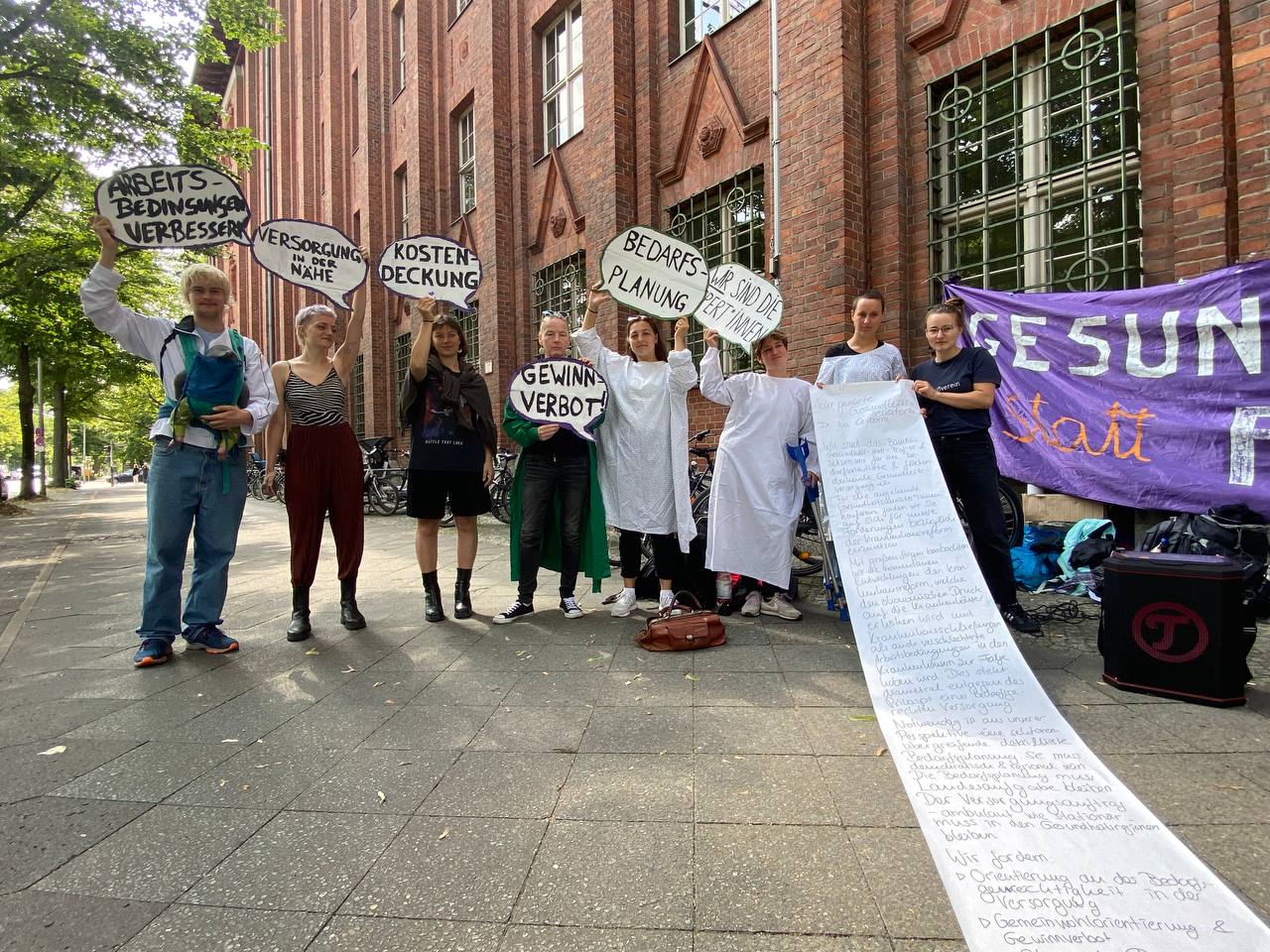 Am 12.05., dem Tag der Pflegenden, waren wir in Berlin vor dem Bundesministerium für Gesundheit und haben mehr Zeit und Geld für Pflegende, die Abschaffung der DRGs und die Vergesellschaftung des Gesundheitswesens gefordert. Hier gibt es die Pressemitteilung, hier die Presseschau.