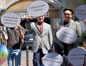 Im Vorfeld der diesjährigen Gesundheitsminister:innenkonferenz, die am 5.-6. Juli in Friedrichshafen stattfindet, organisierten gesundheitspolitische Initiativen vom 24. Juni bis 4. Juli gemeinsame Protestaktionen in ganz Deutschland. Bei Aktionen in Berlin, Marburg, Köln und Düsseldorf kritisierten Pflegekräfte, Ärzt:innen und Patient:innen die Beibehaltung des Fallpauschalensystems (DRG, Diagnosis Related Groups) und die Gefährdung der wohnortnahen Krankenhausversorgung durch die geplante Krankenhausreform.