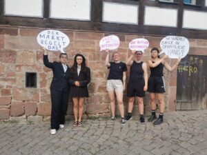 Den Forderungen wurde über eine Performance mit mehreren Teilnehmenden Ausdruck verliehen. Anja Voigt, Krankenpflegerin und aktiv im Berliner Bündnis Gesundheit statt Profite meint dazu: „Wir meckern nicht nur, sondern wir wissen auch, wie es besser geht. Mit unseren Streiks für eine verbindliche Personalbemessung kämpfen wir für unsere Entlastung, für eine gute Patient:innenversorgung und letztlich auch für ein Gesundheitssystem, dass den Menschen wieder in den Mittelpunkt stellt.“
