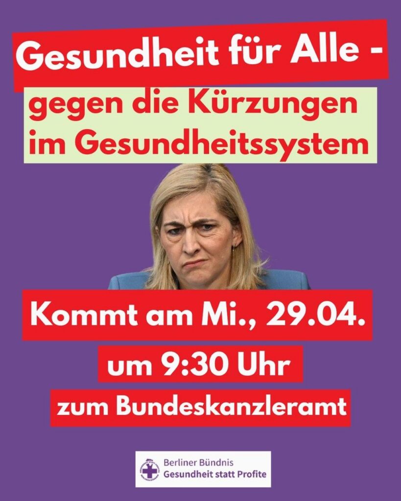 Am 29.04.2026 bringt die Gesundheitsministerin im Kabinett den Gesetzesentwurf zur “Reform” der Finanzierung der gesetzlichen Krankenkassen ein. Das ist keine Reform – das ist ein riesiges Kürzungspaket, ein Kahlschlag der Gesundheitsversorgung.