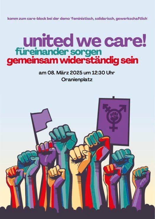 Gemeinsam mit anderen Bündnissen und Organisationen rufen wir, zur Beteiligung am unitetd we care-Block der diesjährigen gewerkschaftlichen 8. März Demonstration auf.