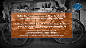 „Kohle für Krankenhäuser statt Kraftwerke“ ist das Motto unseres Fahrradkorsos zu dieser Kundgebung. Mit ihm wollen wir uns solidarisch erklären und zeigen, dass wir hinter den Krankenhausbeschäftigten und ihren Forderungen stehen.